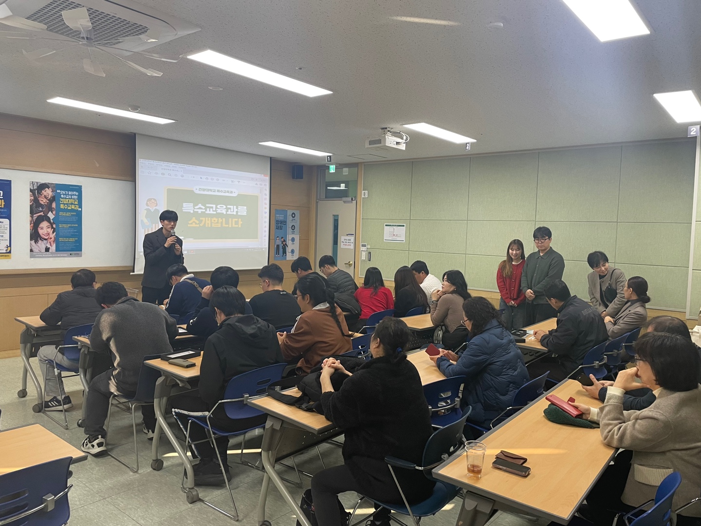 24년 11월 23일(토) 건양대학교 메디컬 캠퍼스에서 우리 건양대학교 특수교육과를 지원한 학생과 부모님 등을 모시고 특수교육과 전공 설명회가 있었습니다. 대학 소개와 더불어 학과의 비전과 교육방향, 앞으로 학생들에게 어떤 지원을 할 것인지도 안내하였습니다. 재학생들과 지원자들과의 대화, 부모님-교수님들과의 대화도 활발했답니다. 곧 온라인으로 학과 설명회가 개최될 예정이니 많은 관심 바랍니다.